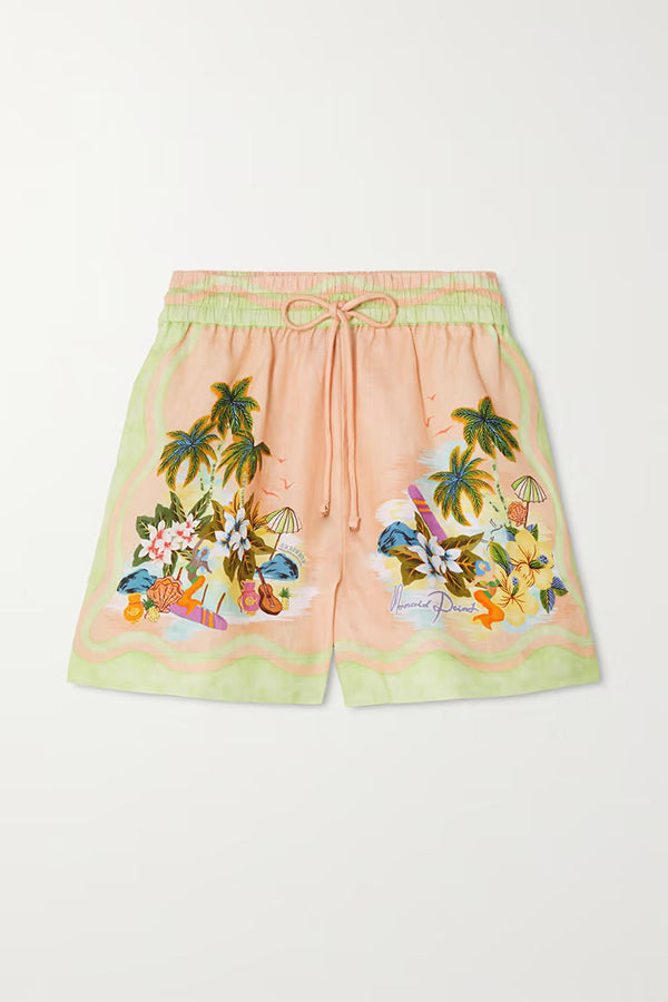 Coconut Scenery Linen Blend Tropical Print Blouse and Elastic Waist Pocketed Shorts Set