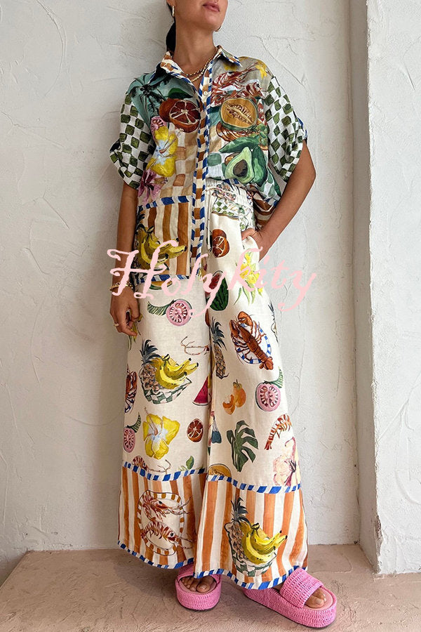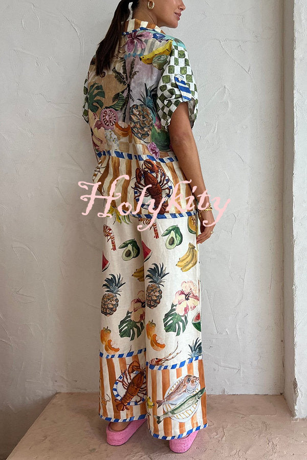 Perfect Day Linen Blend Tropical Fruit Print Elastic Waist Pocketed Wide Leg Pants
