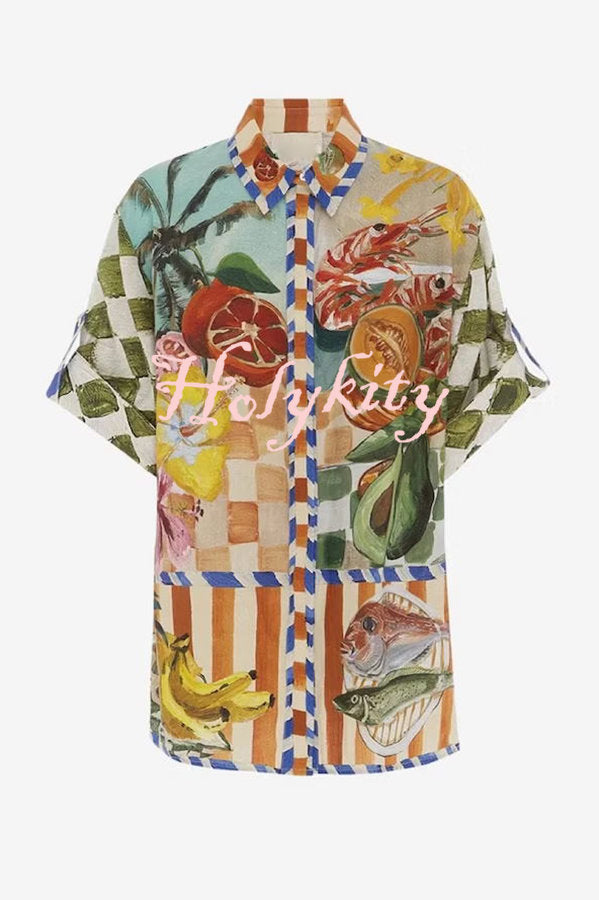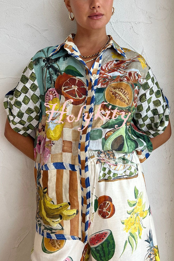 Spicy Lady Linen Blend Tropical Fruit Print Button Down Oversized Blouse